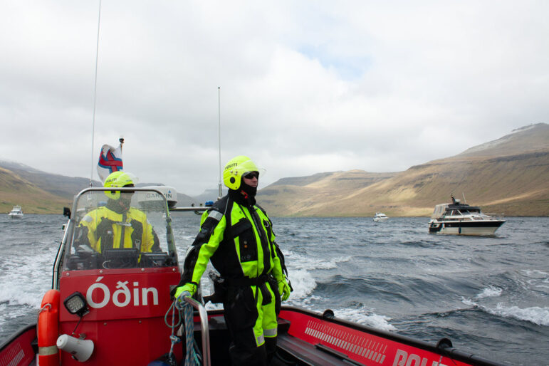 Billedet øverst på siden er taget til den årlige bådfestival på Skálafjørður. Politibåden Óðin sejler med alle bådene til Toftir. Politiet er med i forebyggende øjemed og er med til at sikre, at dem, der sejler bådene, ikke er påvirket af alkohol. Fotograf: Sissal Evudóttir Lervig.